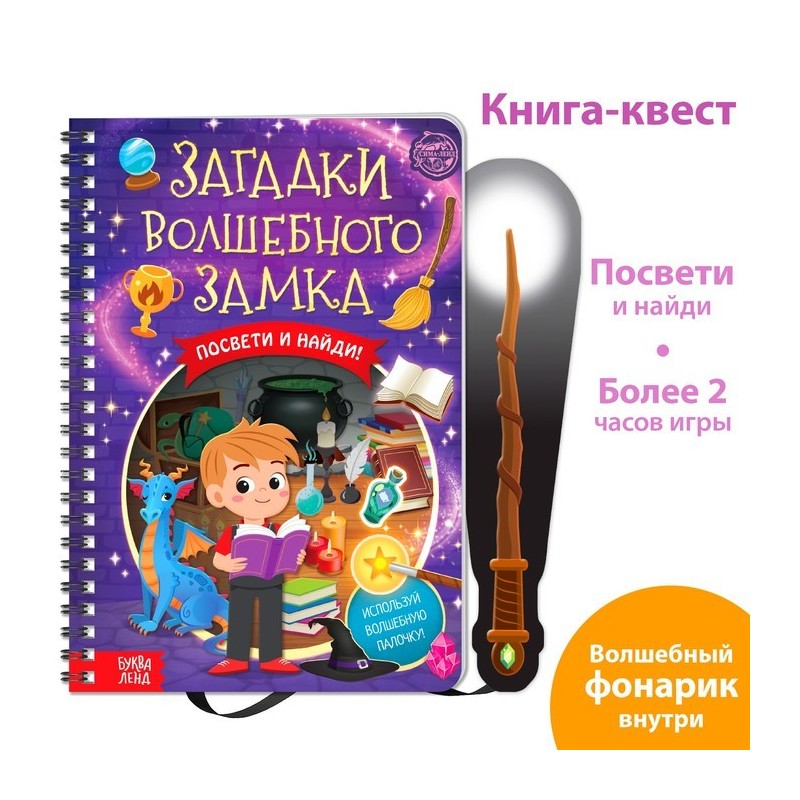 Добро пожаловать в школу волшебства! Вас ждёт удивительное приключение, полное секретов и загадок. Сможете ли вы разгадать все тайны замка и спасти своего лучшего друга? Как разглядеть предметы на чёрных страницах книжки? Возьмите волшебную палочку и вложите её между пластиковой и чёрной страницами. Вы получите яркое изображение на пластиковой странице, где размещаете белую часть палочки (луч). Остальные части страницы (не под палочкой) остаются в тени. Секретная книга с волшебной палочкой привлекает внимание ребёнка своей необычной задумкой. Рекомендовано для детей от 5 лет.