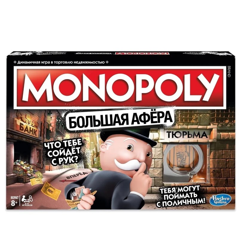 Монополия Большая афера - версия игры, где нарушаются все правила! Игровое поле, на котором приветствуется искажение правил игры, заимствование денег у других игроков и любые другие аферы. Заметки на игровом поле, специальные карточки и правила, которые вдохновляют открыть в себе афериста. Проверните аферу и получите награду, в случае провала достойно примите наказание за мошенничество! Игрушечные наручники оставляют игроков прикованными к игровому полю, пока они не будут выпущены. Покупайте собственность, инвестируйте в дома и отели, собирайте ренту и заключайте выгодные сделки. Возрастные ограничения: от 8 лет. Упаковка: картонная коробка. Комплектация игровая доска (поле) пластиковые наручники с цепочкой и ключом металлические фишки; ретро-автомобиль, цилиндр, кот с мешком, пингвин, динозавр, пёс; два игровых кубика; Разные карточки с возможными афёрами: ограбление банка, обман с игральными кубиками, незаконная прибыль, спекуляция с ценами, ловкость рук, и т. д; держатель для карточек; материал для строительства предприятия; банкноты; инструкция.