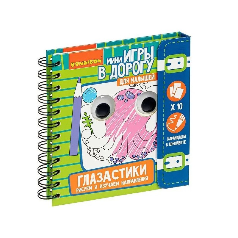 Миниигра в дорогу для малышей "ГЛАЗАСТИКИ" от ТМ Bondibon это интерактивная раскраска с элементами игры и обучения. Малышу обязательно понравится раскрашивать странички и наблюдать за тем, как забавные персонажи, изображенные на них, оживают благодаря интерактивному элементу движущимся глазкам! Каждая страница раскраски содержит и обучающий элемент различные задания на изучение направлений (вверх/вниз/вправо/влево) и повторение цветов. В комплект входят: 10 раскрасок, объемные глазки, набор цветных карандашей. Размер книжки 16х16 см. Забудьте о скучных путешествиях вместе с замечательными минииграми в дорогу от BONDIBON! Красочные и компактные, они будут идеальными спутниками для маленького непоседы. Очень важно развивать у малыша внимание, усидчивость и логику. А лучше делать все это во время увлекательной игры! Возраст 4+