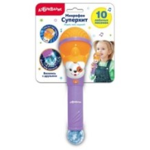 Что нужно для детской зажигательной дискотеки? Конечно, большой микрофон Суперхит с популярными детскими песенками и светомузыкой. Нажимай на кнопочку – слушай 10 песенок из мультиков: • «Песенка про кузнечика» • «Облака» • «Песенка о лете» • «Пропала собака» • «Я маленький щенок» • «С днём рождения» • «Божья коровушка» • «Ах ты, совушка-сова» • «Вышла курочка гулять» • «Чижик-пыжик» Подпевай любимым героям и не забывай танцевать! Разноцветные огоньки мигают под музыку – вот это волшебство!