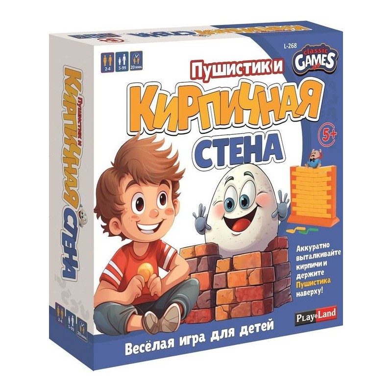 Пушистик и кирпичная стена — яркая и динамичная настольная игра, которая развивает координацию, мелкую моторику и внимание, превращая каждый игровой сеанс в настоящее приключение. Пушистик любит все знать и видеть. Он залез на высокую стену и задача игроков - не дать ему упасть. Игра идеально подходит для детей от 5 лет и старше, а также для всей семьи. Рассчитана на 2-4 игроков, что делает её отличным выбором для веселых вечеров в кругу друзей или семейных посиделок. Постройте стену и испытайте свою ловкость и терпение! Комплектация: 1 игровая фигурка — Пушистик, 1 основа для стены, 2 рамки для стены, 44 кирпича, 2 мастерка, инструкция. Цель игры: построить стену с помощью основания, двух рамок для стены и кирпичиков, поставить пушистика на вершину игры и не дать ему упасть, вытаскивая по очереди кирпичи мастерком.