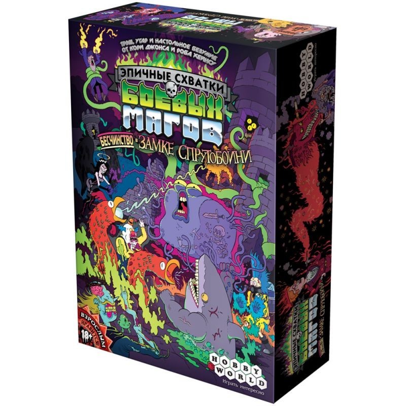 Уже раздал волшебного леща всем колдунам, а кулаки по-прежнему чешутся? Пора вписаться в новый магический замес — олимпиада по выносу мозга и весёлому беспределу объявляется открытой! Кастуй боевые заклинания и прикармливай зловещих тварей, грызущих цепи в подземельях замка Спрутобойни. Неистовый Змей Куриныч, несокрушимый Кубодемон и проворный Гамадрантул превратят твоих недругов в лужицу волосатой эктоплазмы. А если ты и сам склеил ласты за компанию, смелее воскресай, когда никто не ждёт, и с ходу вливайся в грандиозное бесчинство! Главные приколы Самостоятельная игра, которую можно смешать с другим набором «Эпичных схваток боевых магов»! Умопомрачительный дебош для 2–6 колдунов! Элементарные правила и бесконечная реиграбельность! Безумные комбы из 128 новых карт заклинаний! 8 новых колдунов - у них серьезные намерения! Крутые нововведения: жуткие твари, литры крови и дивные нежданчики! Вариант игры «Короткий турнир» — для тех, кто предпочитает ушатывать врагов быстро. 178 карт заклинаний (по 2 шт. каждого экземплаяра), сокровищ и дохлых колдунов 8 планшетов героев 7 медалей недобитых колдунов